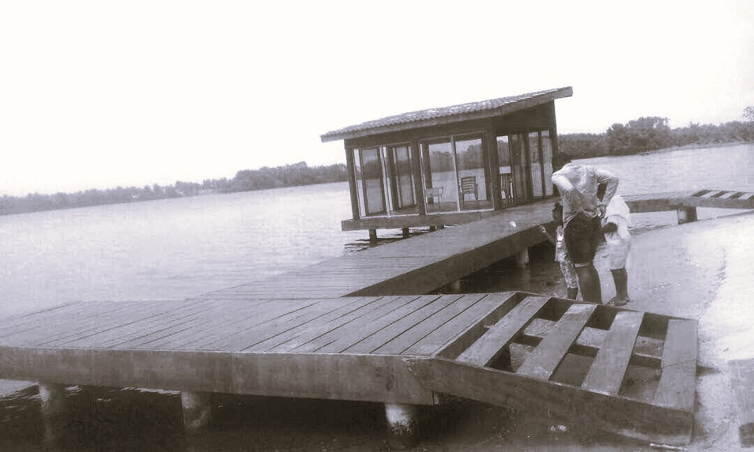 Le cahier des charges du client comportait en fait trois pontons sur pilotis reliés par une passerelle ainsi qu’un apatam entièrement vitré sur les 4 façades.
